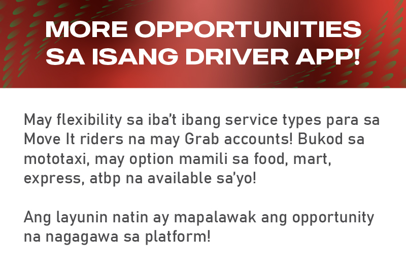- Tanging mga Move It Drivers na may EXISTING GrabFood/GrabExpress lamang ang magkakaroon ng GrabFood/GrabExpress servicetypes. Hindi rin automatic na magkakaroon ng Move It servicetypes ang existing GrabFood/GrabExpress riders. Para sa mga magdadagdag ng service types, ito ay dadaan sa reboarding process at magdedepende sa available slots ng bawat fleet.