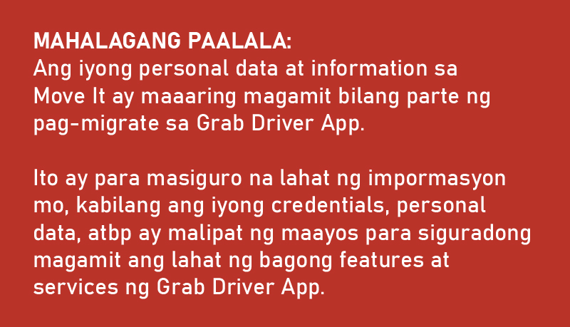 - Makaka-receive ka ng text tungkol dito kasama ng ano ang mga dapat gawin upang maging smooth ang iyong migration. Habang hindi pa nakaka-receive ng message, patuloy na gamitin ang iyong Move It Driver App.