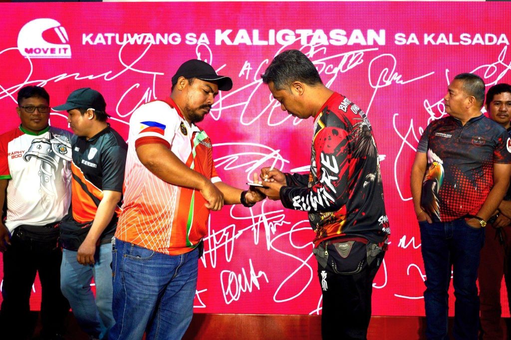 Leaders of MOVE IT rider-partner communities sign the Katuwang sa Kaligtasan sa Kalsada pledge as they co-champion a safety-first culture in the motorcycle-taxi industry. Spearheading the pledge is Motorcycle Community Philippines Chairman Romeo Maglunsod
